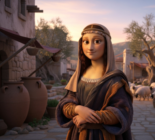 <Criar um prompt detalhado para eu criar um quadro da Mona Lisa no estilo PIXAR ambientado na era de Jesus Cristo.>