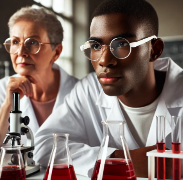 <Create an image of a black male scientist and another older female scientist in their 50s with brown skin in a chemistry lab. They are wearing a white lab coat and white goggles, looking closely at two flasks of red liquid on a table in front of you. The scientist has very short, almost shaved hair. The environment should look like a scientific laboratory, with details such as laboratory equipment and soft lights that create a focus on the scientist and the flasks.” the SCIENTIST HAS A serious and neutral look, focused on the results. The laboratory must have other typical elements such as microscopes, beakers, or even blackboards with notes>.