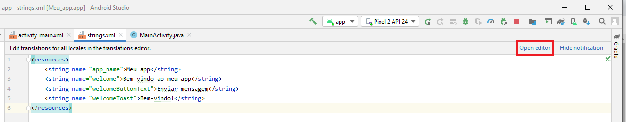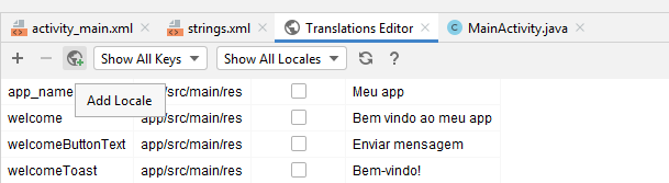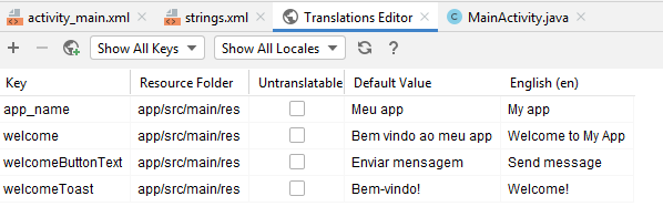 O Android Studio oferece uma ferramenta Translations Editor para fácil criação e edição de traduções de strings existentes no projeto. Para usar essa ferramenta siga os passos: