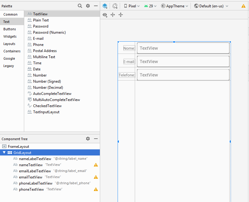 - Adicione ao LinearLayout três elementos TextInputLayout, aba Text Para cada novo elemento será criado também uma EditText.