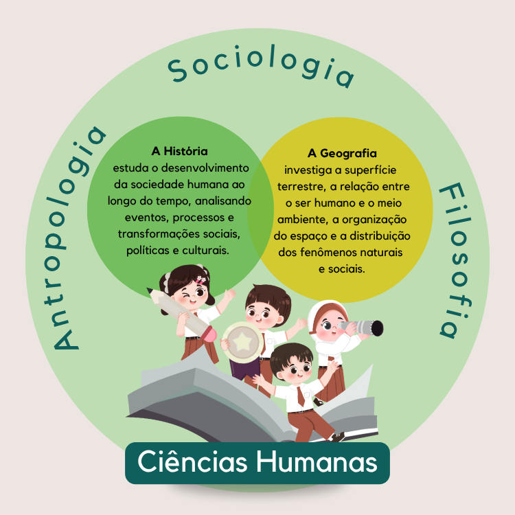 Para iniciar nossa conversa, é importante salientar o quão amplo é o conhecimento que abarca as ciências humanas. Podemos falar de história e geografia, mas também de filosofia, sociologia, antropologia, entre outras áreas de igual valor e importância. Por questões de delimitação curricular, oficialmente focamos no ensino de história e de geografia, mas sempre lembrando da importância de pensar a relação dessas duas disciplinas entre si e com as demais de forma interdisciplinar.