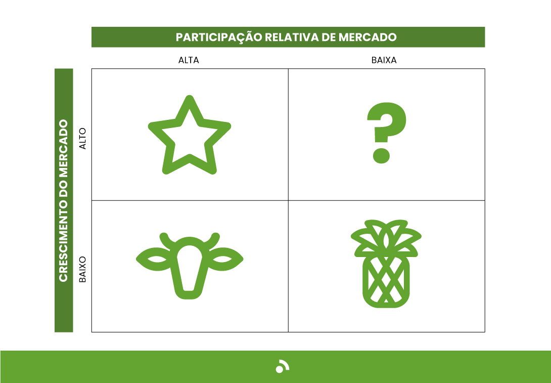 Considerando esse critérios, a matriz divide-se em quatro quadrantes, que vão representar uma categoria de produto (com características peculiares), como na imagem a seguir: