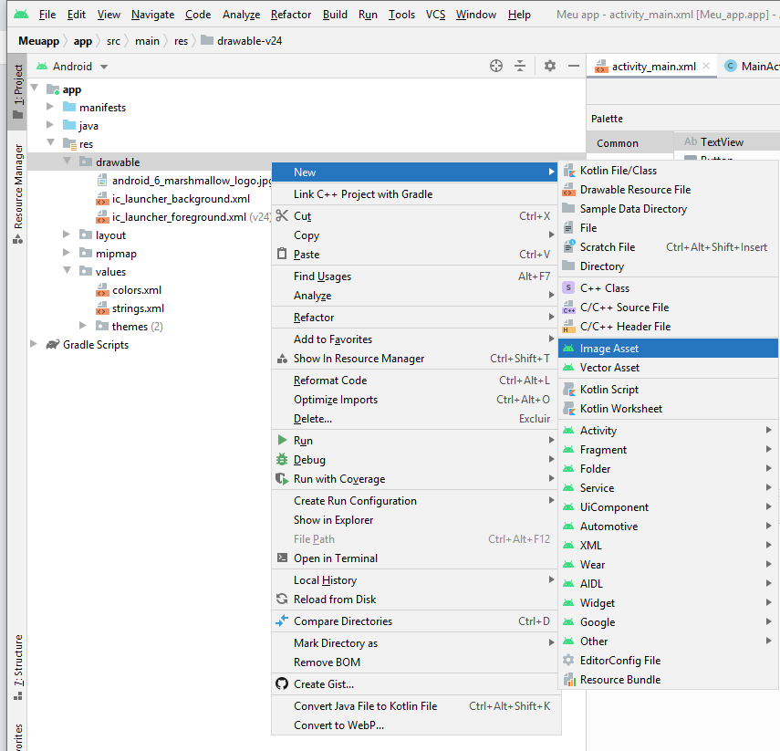 Quando o aplicativo for instalado no dispositivo, seu ícone e nome serão mostradas junto a todos os aplicativos instalados no celular. Para modificar o ícone de instalação, devemos clicar com o botão direito do mouse sobre o diretório RES e selecionar New > Image Asset. Isso irá abrir uma janela de edição de ícones do próprio Android Studio chamada Asset Studio.