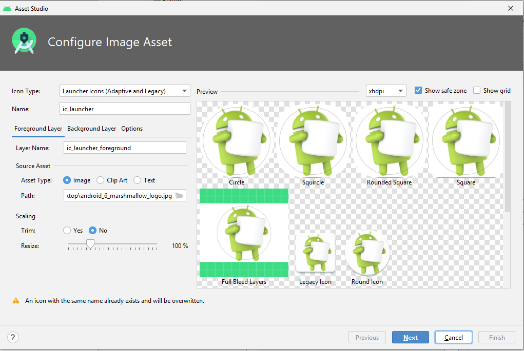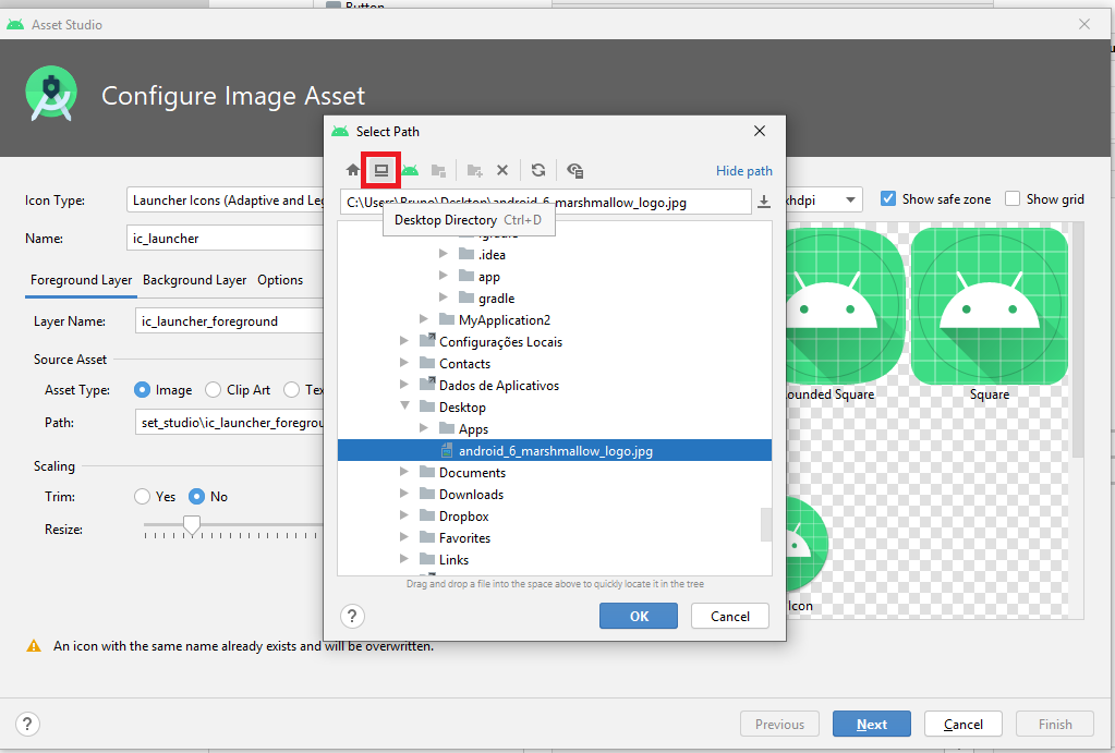 O Android Studio irá criar diferentes versões do ícone para atender as necessidades de tamanho de tela e DPI e diferentes dispositivos. A arquivo de ícone por padrão irá se chamar ic_launcher.png e será salvo na pasta mipmap.