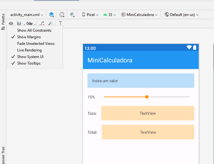 O resultado final é apresentado na imagem a seguir. Para ver a status bar e app bar é necessário ativar a exibição da interface do sistema Android. Procure o ícone parecido com um olho e ative a opção "Show System UI" como na figura.
