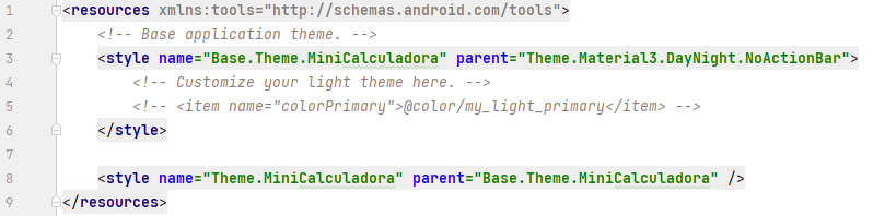 Dentro deste arquivo estão todas as configurações do tema do aplicativo. Na template atual do Android Studio o tema padrão aparece com informações em branco e se configura para não mostrar a app bar (isso pode ser visto na especificação NoActionBar). Basicamente, o arquivo apenas cria um tema baseado no DayNight do Material Design 3 e coloca um nome de acordo com o projeto.