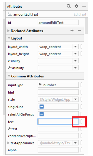 Para adicionar os novos recursos strings ao elementos gráficos da tela procure a propriedade text e clique no botão branco ao lado. Observe que a posição exata da propriedade pode variar dependendo do tipo de elemento sendo configurado (TextView, EditText, SeekBar). Use como referência a figura: