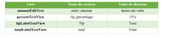 Observe que são omissas as strings para amountTextView, tipTextView e totalTextView. Isso ocorre porque os seus valores serão calculados e apresentados dinamicamente.