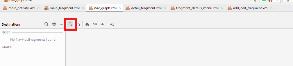 Clique no botão ilustrado na figura para adicionar um novo destino (New Destination) e selecione o fragmento principal do nosso projeto.