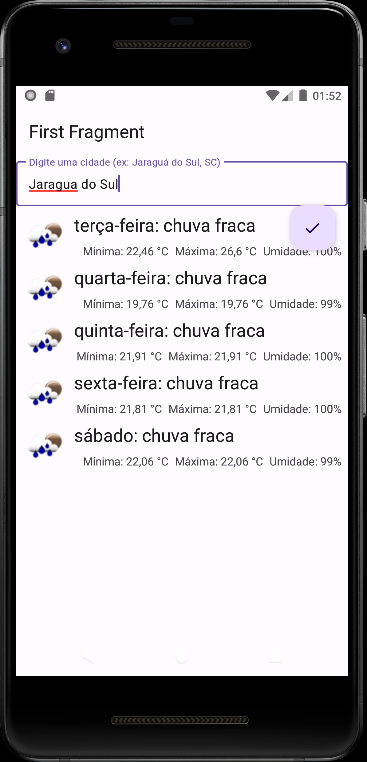O aplicativo faz uso dos serviços web REST fornecidos gratuitamente pela OpenWeatherMap para obter dados de previsão do tempo de 5 dias para uma cidade específica. Esses dados climáticos são retornados no formato JSON (Javascript Object Notation). A lista de informações climáticas é apresentada em uma componente ListView, que é responsável por exibir uma lista de itens.